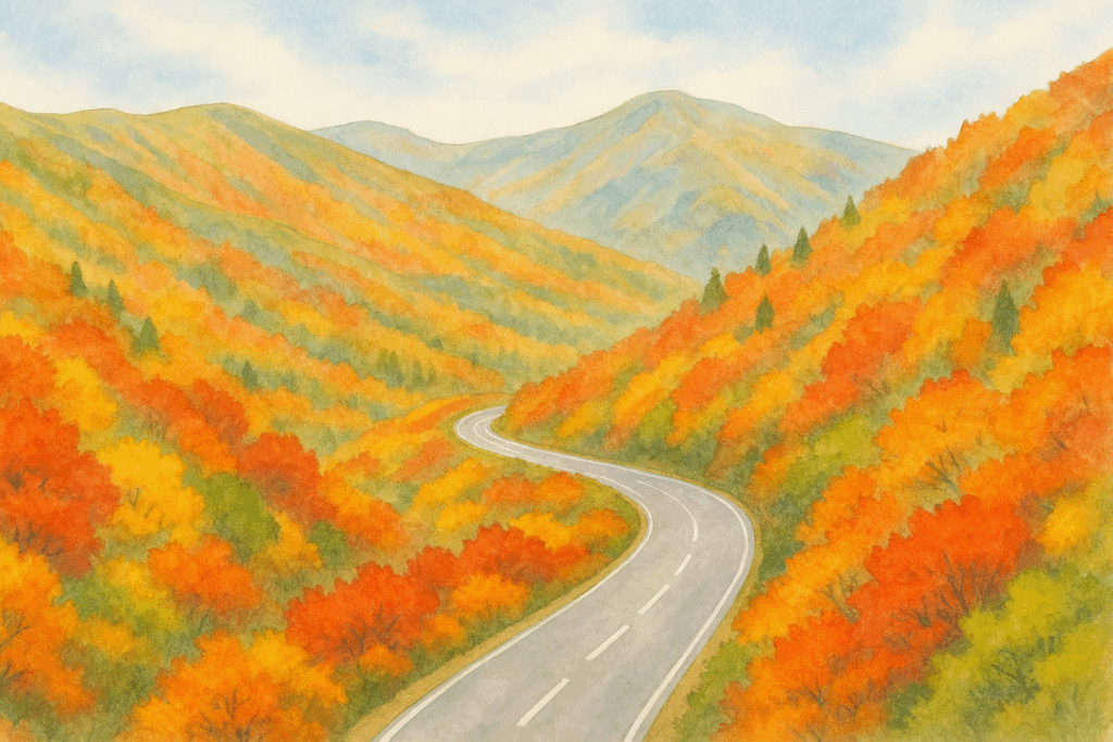 「八幡平アスピーテライン」は、岩手県八幡平市と秋田県鹿角市を結ぶ全長約27kmの山岳ドライブウェイ。標高1,000〜1,600mの稜線を走り抜けるルートは、まさに“紅葉の空中回廊”と呼ぶにふさわしい絶景が広がります。